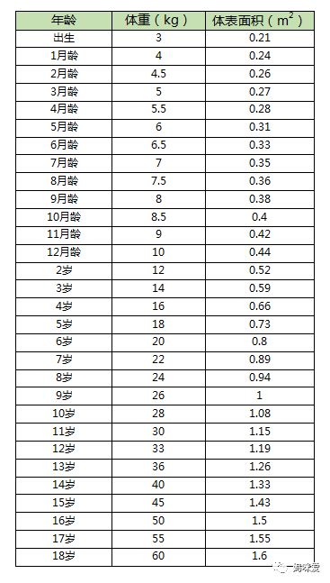 儿童剂量=儿童体表面积(m2)×每次(日)剂量/ m2